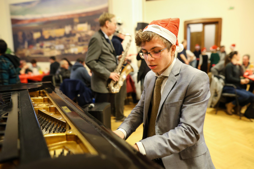 A Szent Kolumbán-plébánián a közeli, Rózsa utcai idősek otthonának lakói közül Laci bácsi szájharmonikán, az egykor bárokban és presszókban is fellépő Aranka néni zongorán játszott slágereket és karácsonyi számokat.