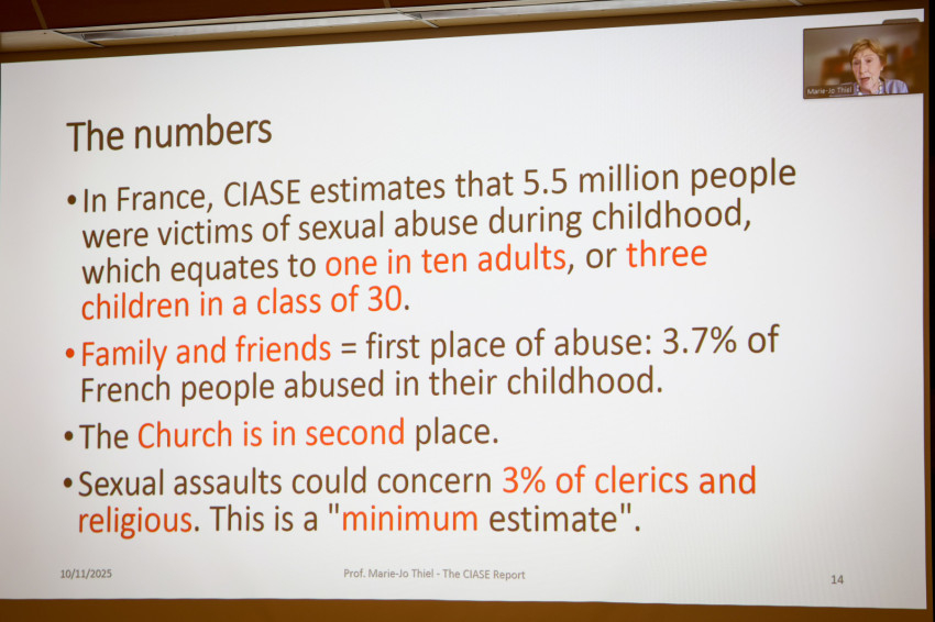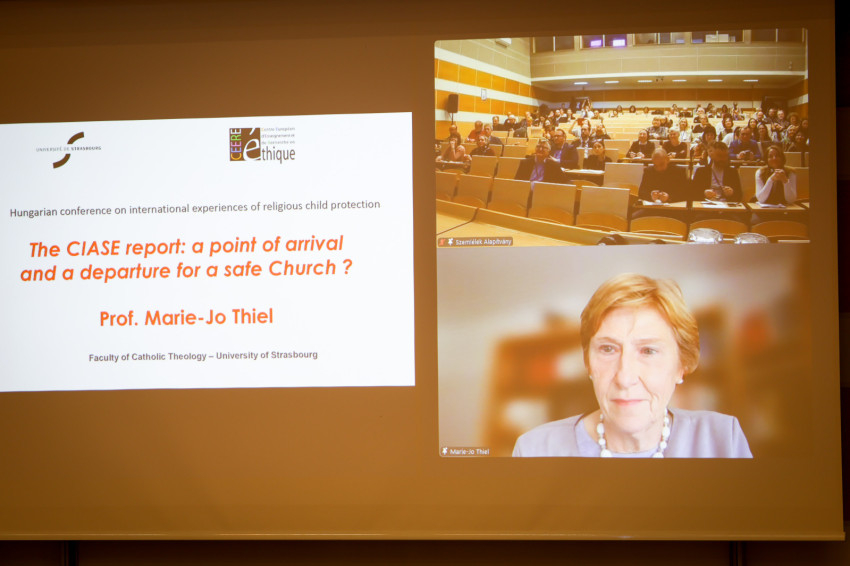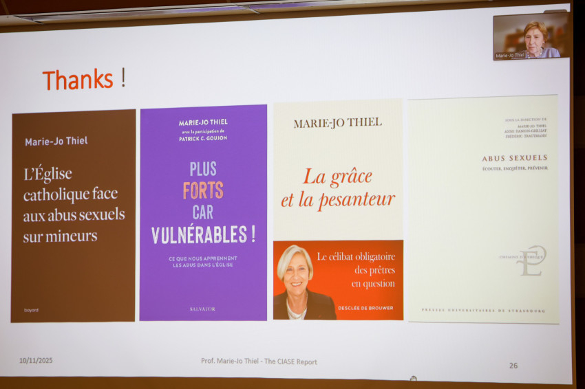 Marie-Jo Thiel orvos, erkölcsteológus, aki internetes kapcsolaton keresztül jelentkezett be a konferenciára, The CIASE Report címmel adott képet a francia helyzetről. A francia katolikus egyház az elmúlt években mélyreható, rendszerszintű reformokba kezdett, amelyek célja az igazságtétel, a felelősségvállalás és a jövőbeli visszaélések megelőzése. A folyamat még nem zárult le, de az átláthatóság, a világiak bevonása és az áldozatok elismerése felé tett lépések valódi paradigmaváltást jeleznek az Egyház történetében.