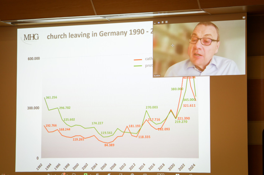 Az előadó szerint a válságnak hosszú távú társadalmi következményei vannak, ezek megmutatkoznak a németországi egyházelhagyások kiugróan magas számában is. Míg a ’90-es évektől a 2010-es évek elejéig hullámzó, de összességében mérsékeltebb volt a kilépések aránya, 2018-tól drámai emelkedés kezdődött, amely 2022-ben tetőzött több mint félmillió kilépővel mindkét történelmi egyház (a katolikus és evangélikus) esetében, a számok ma is rekordmagasak, ami az intézmények mély és tartós presztízsvesztését jelzi.