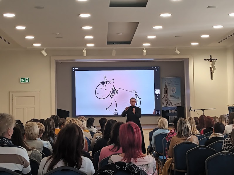 A nap további programja a Szent Orsolya Gimnáziumban zajlott. Kovács András igazgató röviden ismertette a közelmúltban megújult patinás épületegyüttes történetét, majd a díszteremben következett Stift Zoltán, azaz Angelico atya napot záró rajzos előadása.