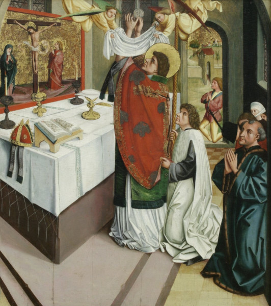 A vers megírását ihlető festmény: Szent Márton albengai miséje (oltárszárny ünnepi oldalának részlete ismeretlen helyről, Magyar Nemzeti Galéria, 1490 tájt)