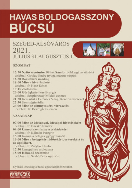 Havas Boldogasszony ünnepe egy 4. századi hagyományra nyúlik vissza. A legenda szerint egy római kereskedőnek és feleségének megjelent a Szűzanya, és azt kérte tőlük, építsenek neki templomot azon a helyen, amelyet másnap hó fog borítani. Így épült fel Róma egyik dombján a Santa Maria Maggiore-bazilika Havas Boldogasszony tiszteletére, és ennek a csodás eseménynek az emlékére építették fel 1503-ban Szeged-Alsóvárosban a ferencesek gyönyörű gótikus csarnoktemplomát, szintén Havas Boldogasszony titulussal. Az augusztus eleji búcsú az évszázadok során fontos vallási ünneppé, a Szegedről elszármazott családok találkozási alkalmává is vált.