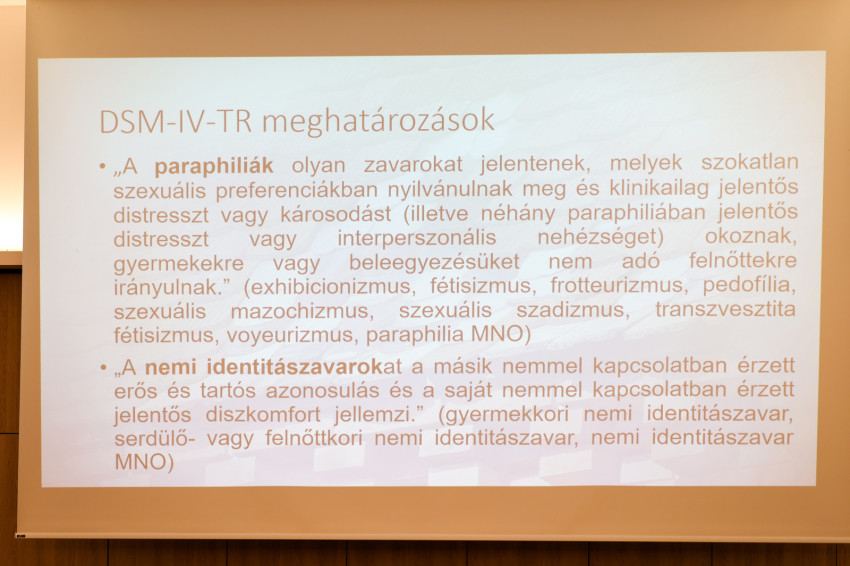 Az előadó rámutatott, a DSM-ből úgy került ki a homoszexualitás, hogy azt nem előzte meg tudományos diskurzus vagy vita.