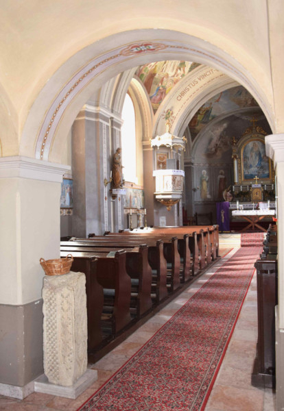 A templom korábbi barokk berendezéséből megmaradt a szószék előtt elhelyezkedő mellékoltár aranyozott, fehér festésű fa tabernákuluma, illetve egy barokk faragott, aranyozott fa keretben – feltehetően a korábbi mellékoltár középrésze – és a Kálvária háromalakos kis szoborcsoportja.