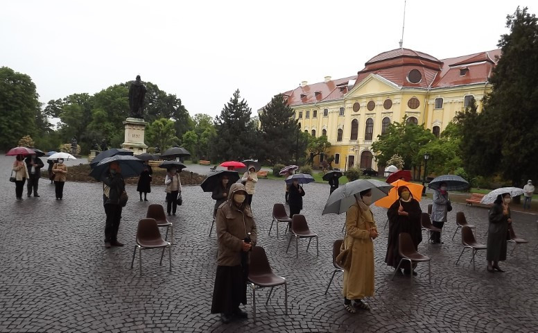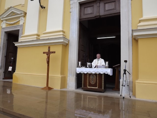 A hívek a székesegyház főbejárata előtt álltak, a kötelező fizikai távolságtartásnak eleget téve.