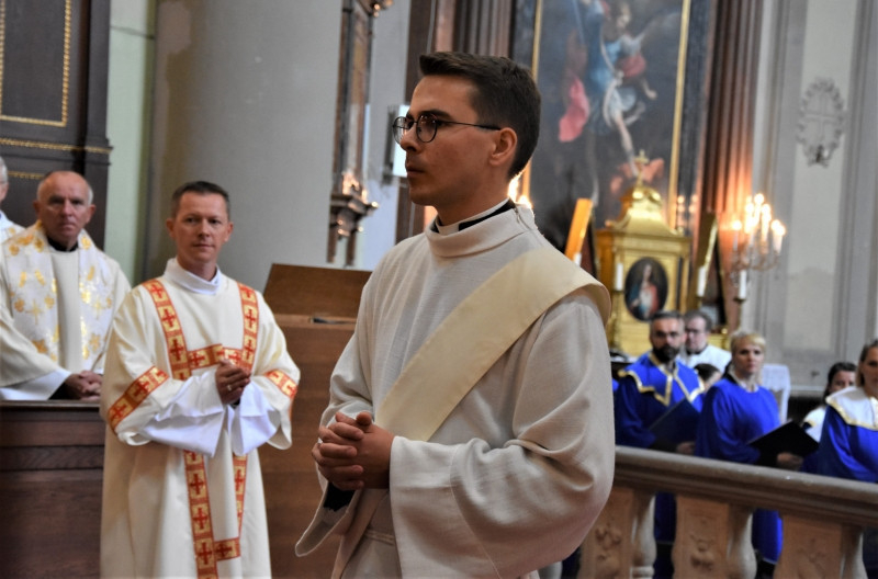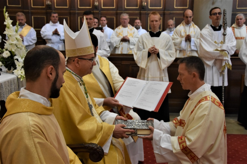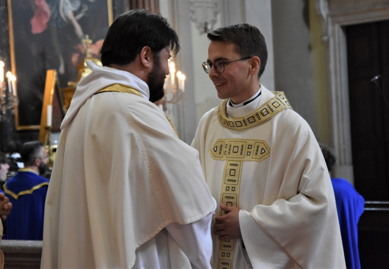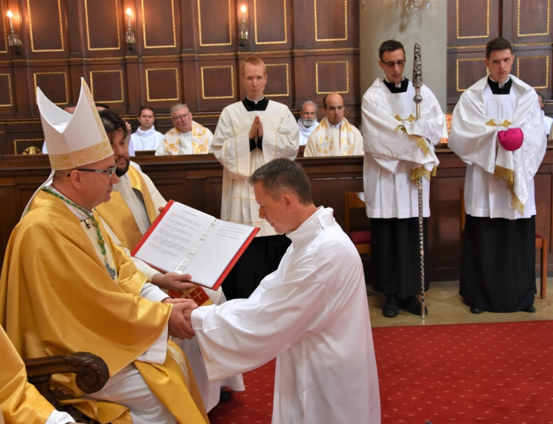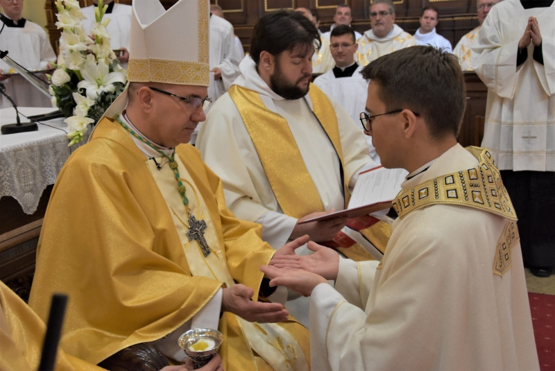„Az olvasmányban hallottuk, hogy »az Úr kiválasztotta Lévi törzsét, hogy színe előtt álljanak és szolgáljanak neki«. Téged is hív az Ő szolgálatára az oltárnál, ahogy az ígéretekben elhangzik: az Ő szent testét és vérét fogod érinteni és a híveknek nyújtani. A szerpap speciális küldetése a diakónia, ahogy a fölszentelő imádság mondja: az asztalszolgálat, a betegekkel és a szegényekkel való törődés. Most, a szentelésben ezekhez kapod meg Isten ajándékait, karizmáit. Kívánom, hogy plébánosoddal összhangban tudd betölteni szent szolgálatodat” – mondta Marton Zsolt.