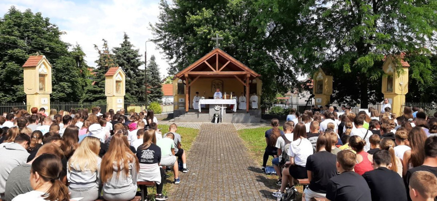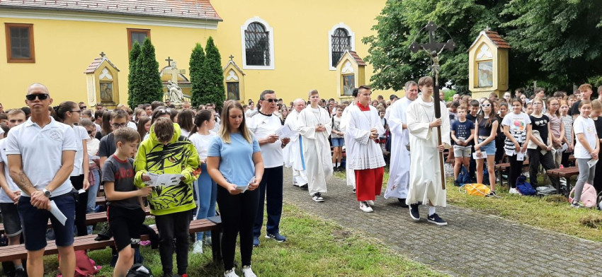 A Mosolygó Szűzanyához a vincés diákok gyalogosan és kerékpárral érkeztek, és először imát mondtak a kegytemplomban Radó Tamás püspöki helynök vezetésével. 10.30-kor szabadtéri szentmisén vettek részt, melyet Szaradits József mutatott be. A szentmisében Németh László lelkipásztori kisegítő és Bakodi Luca 8.B osztályos tanuló ismertették az osli Mosolygó Szűzanya történetét Nehéz Ferenc feldolgozásában.
