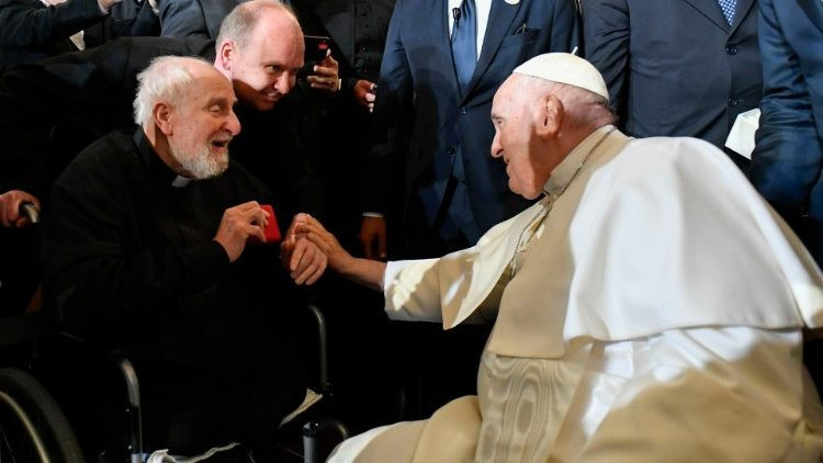 Kérdésünkre Mihály atya, akit Serfőző Levente, a Szeged-Csanádi Egyházmegye oktatási püspöki helynöke kísért el a találkozóra, elmesélte: „Amikor jött középen előre a bazilikában, én ott voltam a szélén. Megállította az őt toló segítőjét, és először megfogta, majd megcsókolta a kezem. És megáldott. Odaajándékoztam neki az általa írt, és kiolvasott Álmodjunk együtt – Út egy jobb jövő felé című könyvet. Azzal váltunk el, hogy azt mondta, imádkozzunk érte.”