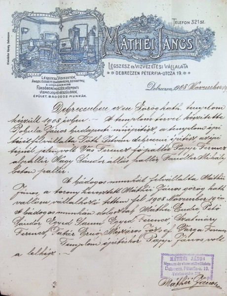 Senki figyelmét nem kerülheti el az a csodálatos, részletekben gazdag ábrázolás, amely a papír tetején található, elfoglalva annak mintegy egyharmadát. Ez – amint az a kép szélén is jól olvasható – Kleinfeller Károly munkája, aki grafikus, litográfus volt, s kőnyomdát működtetett Debrecenben. E különleges díszítés kimunkált betűkkel hirdeti Máthéi János légszesz- és vízvezetési vállalatát, feltüntetve annak legfontosabb adatait. A grafika másik felén lévő korabeli fürdőszoba képe pedig az alatta lévő felirattal együtt jelzi az olvasónak, hogy a vállalat a bádogosmunkák mellett sok egyéb feladatot is elvállalt.