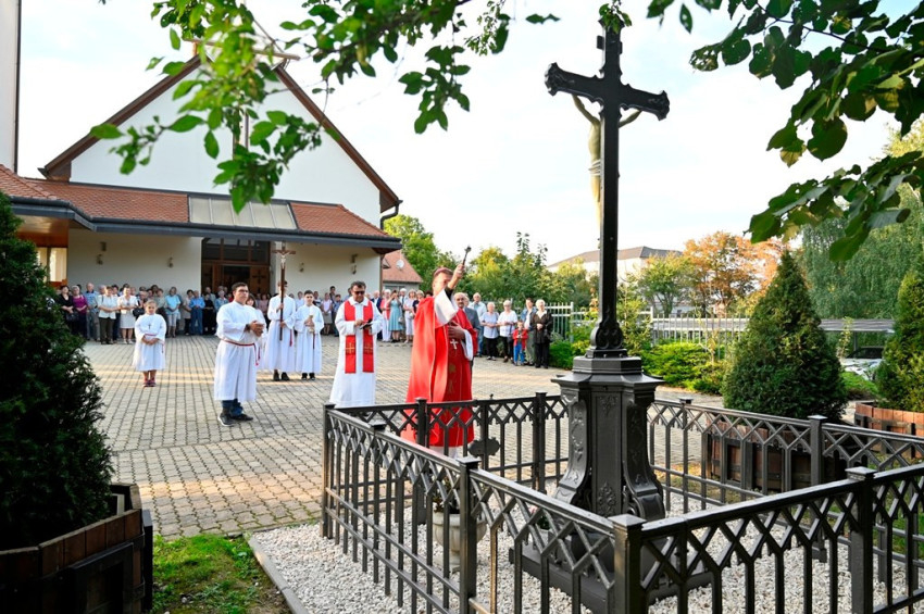 A keresztáldás előtt Oláh Attila, az egyházközségi képviselő-testület elnöke felelevenítette a most felállított felújított kereszt történetét. A kereszt 160 év alatt az ötödik helyre került. 1862-ben állíttatta báró Lerchenfeld Ernesztína a Nagyszőlősből (Somlószőlős, 1898-ig Nagyszőlős, település Veszprém megyében – a szerk.) Szombathelyre vezető országút mellé, ami ma a Szent Gellért utca és Rumi út kereszteződése.