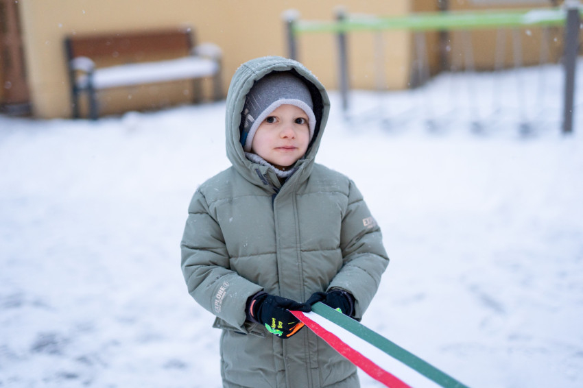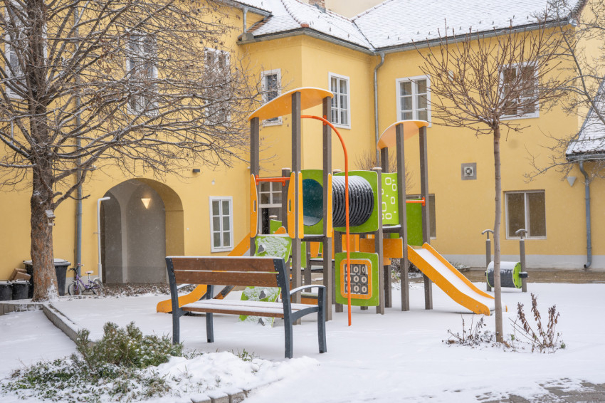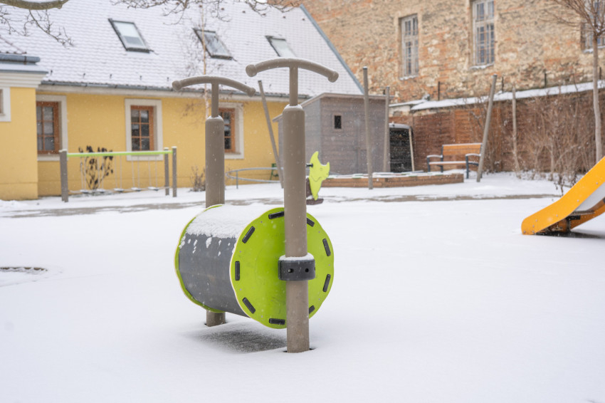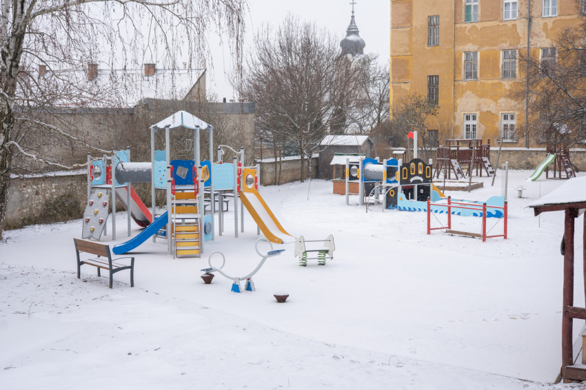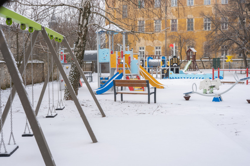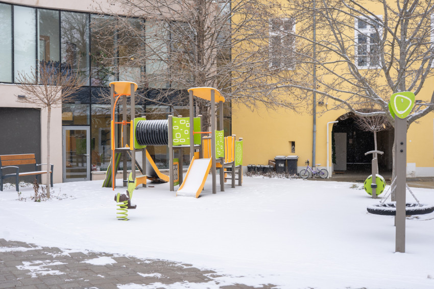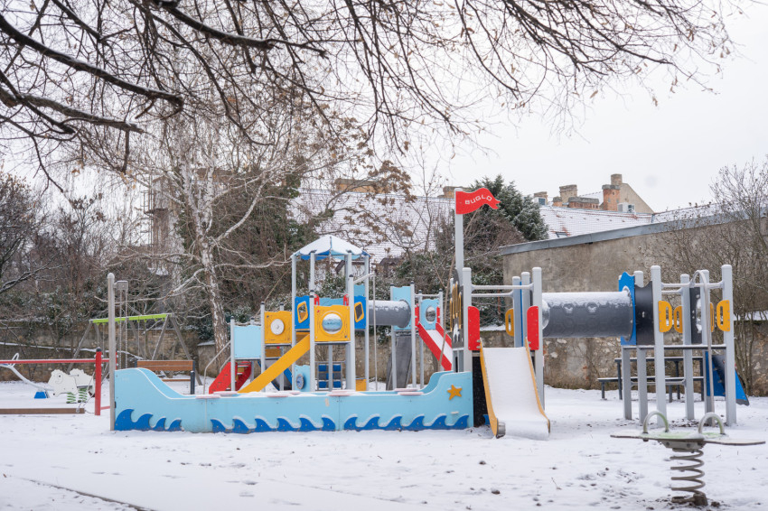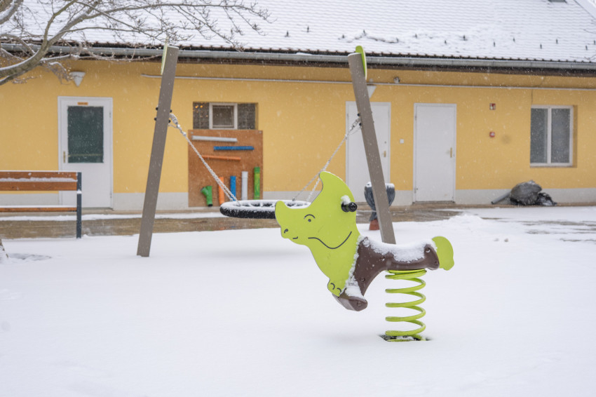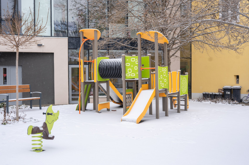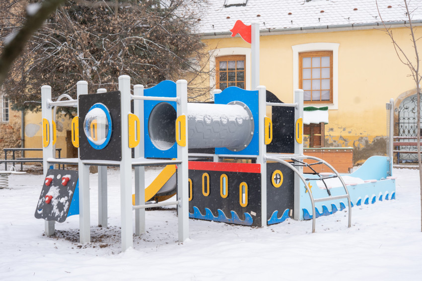 Ezen a délutánon sűrűn hull a hó. A gyerekek azonnal birtokba veszik a játékokat, szüleik és az óvó nénik vigyázzák a csúszdázókat.