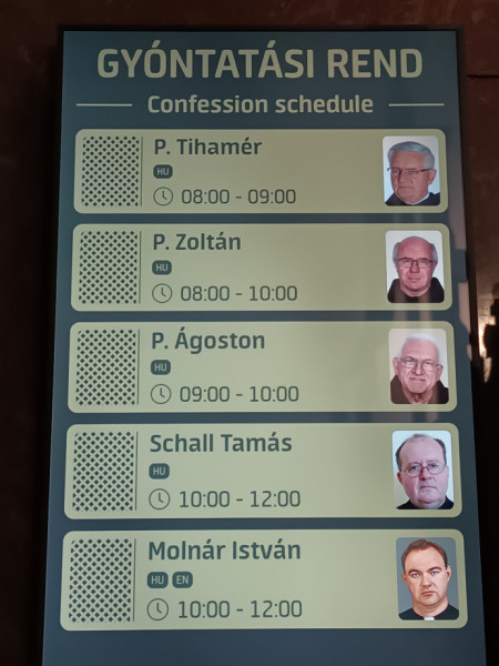 A gyóntatás, a gyóntatók időbeosztás szerinti rendjét, valamint az idegen nyelvű gyónás lehetőségeit minden héten közöljük a templom honlapján és Facebook-oldalunkon. A nagyheti beosztás március 15-től elérhető lesz, a templomba betérve pedig digitális tábla mutatja az atyák gyóntatási idejét, hogy melyik gyóntatószékben találhatók meg, és hogy a magyaron kívül milyen nyelven értenek.