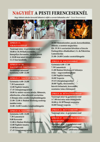 A gyóntatás részletes beosztása megtalálható a templom honlapján is, a nagyhét liturgikus rendje pedig az alábbi plakáton: