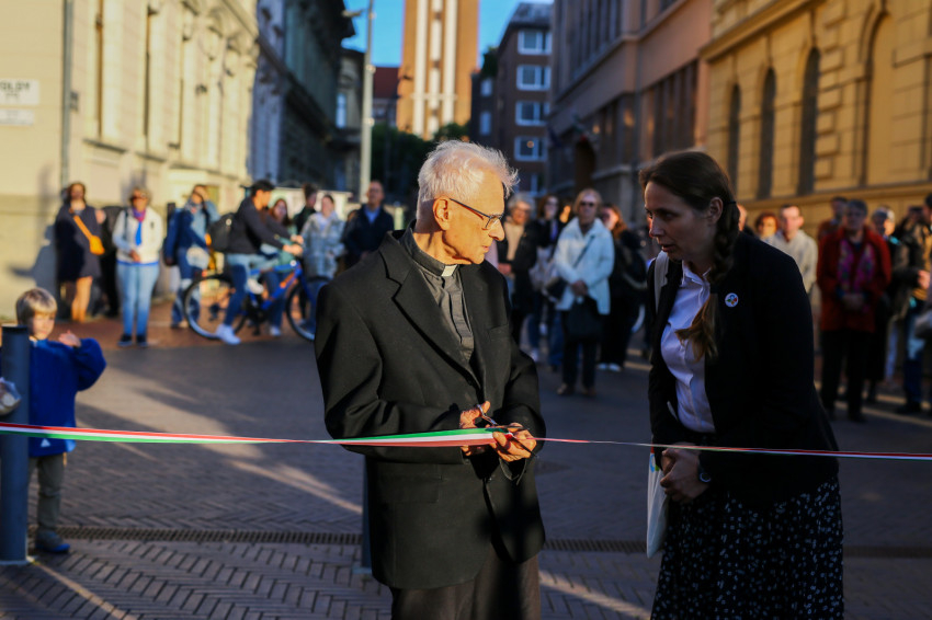 A nyugalmazott főpásztor ezután átvágta a nemzeti színű szalagot, melyet egy karolinás és egy piarista diák tartott a kezében. Ezzel megnyitotta a tárlatot.