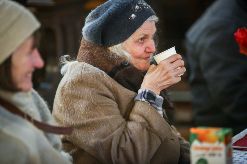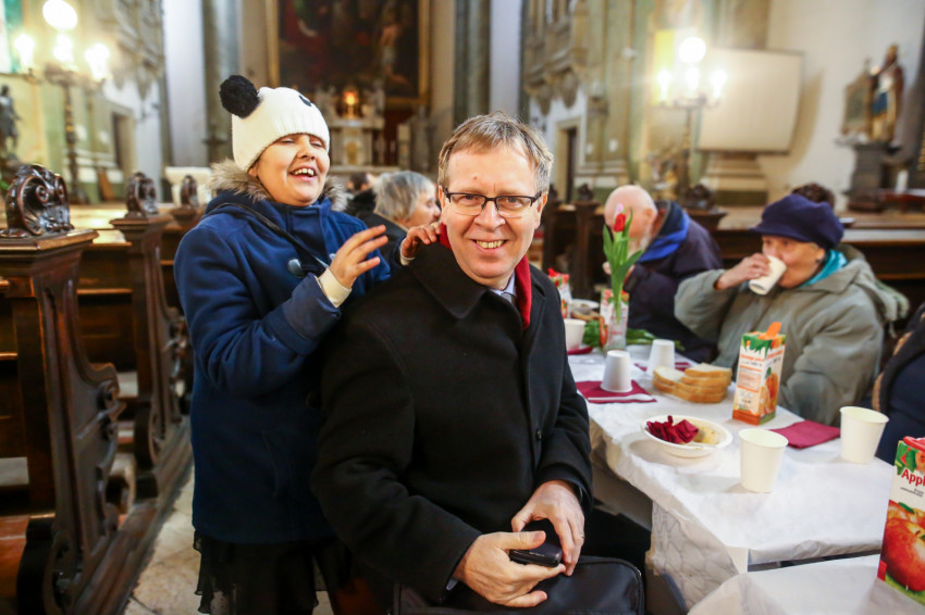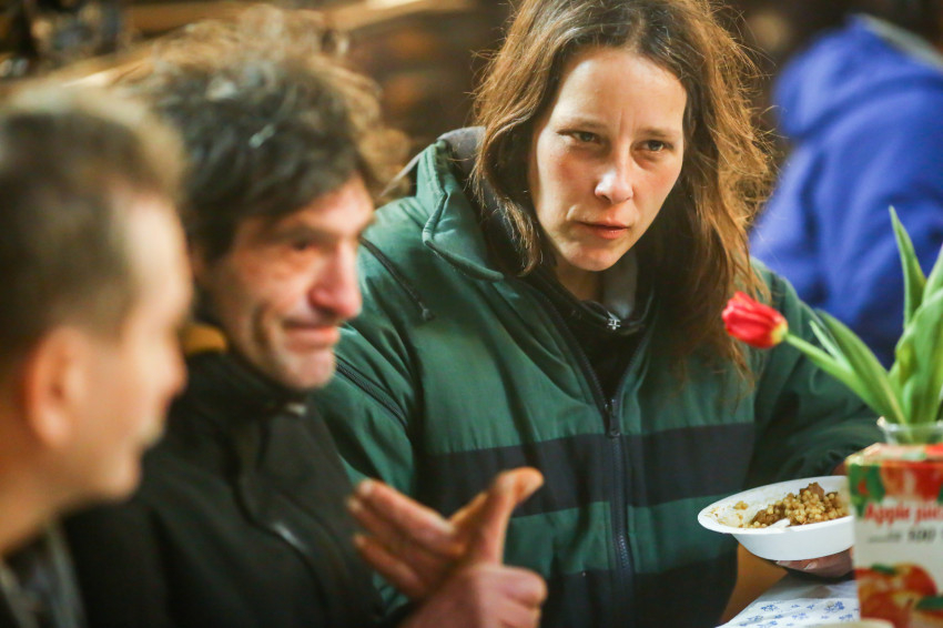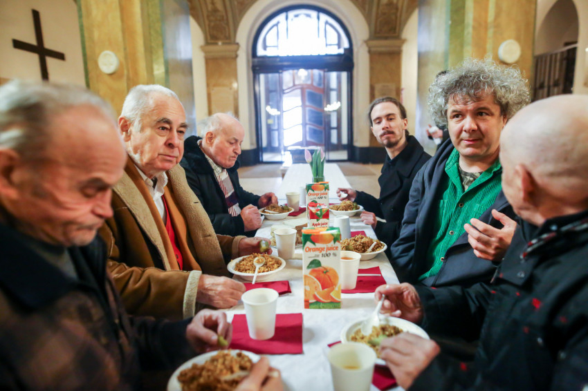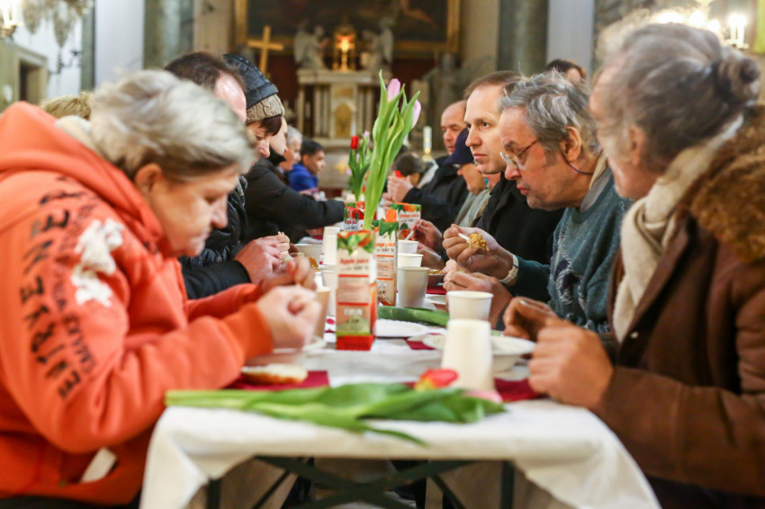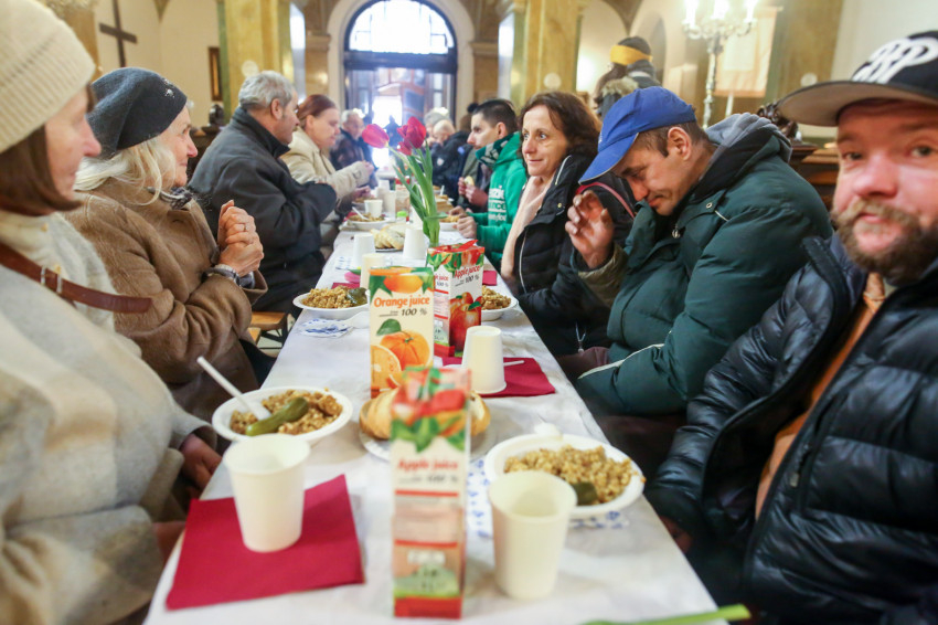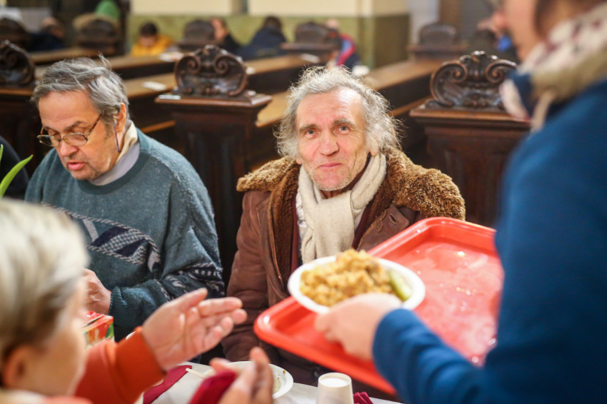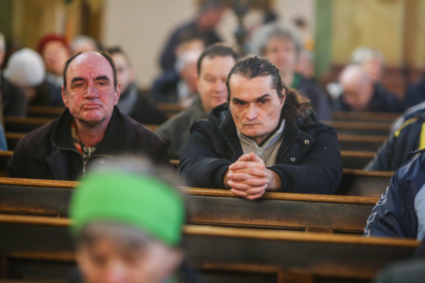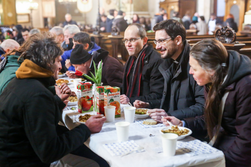 Kérjük Istent, hogy bocsássa meg, amikor közönyösek voltunk, és életünk legyen tanúságtétel, hogy a szívünkben Isten szeretete felébresztette az emberek iránti szeretetet – zárta homíliáját Mohos Gábor püspök, aki koncelebráló paptársaival – Michels Antal plébánossal és Gájer Lászlóval, a Pázmány Péter Katolikus Egyetem Hittudományi Karának tanszékvezető tanárával – együtt leült a templomban ókeresztény módra, az oltár meghosszabbításaként megterített asztalokhoz, hogy együtt ebédeljen a hajléktalan, szegény emberekkel, akik eljöttek a szentmisére, hogy megemlékezzenek sorstársaikról, barátaikról, családtagjaikról.