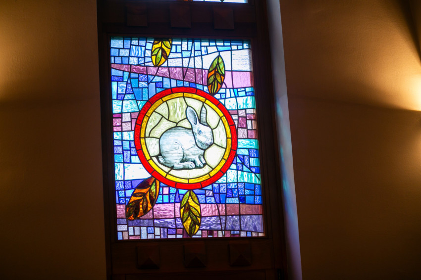 Az oldalablakokon pedig a szentek képmásai helyett állatábrázolások láthatók.