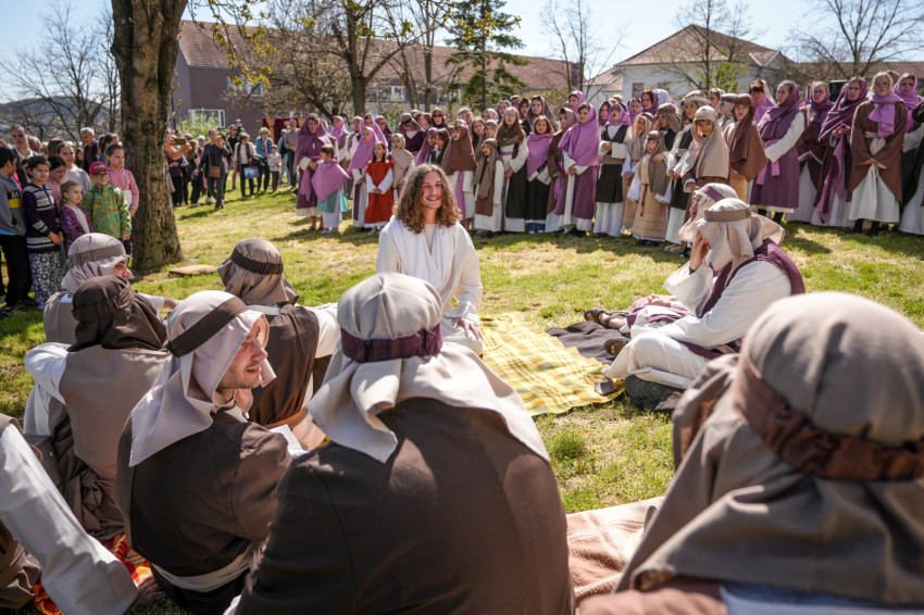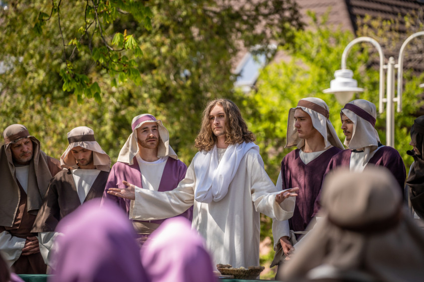 A szabadtéri helyszín különleges atmoszférát kölcsönzött az előadásnak, és lehetőséget teremtett arra, hogy minél többen részesei lehessenek az élménynek. Az előadás egyik emlékezetes pillanata Jézus jeruzsálemi bevonulása volt, az őt megformáló szereplő valódi szamár hátán érkezett. A jelenet arra mutat rá, hogy Jézus nem hódítóként érkezik, hanem szelíd, alázatos Megváltóként. A szamár megjelenése – különösen a gyermekek számára – élővé és kézzelfoghatóvá tette a bibliai történetet, sokak arcára mosolyt csalt, miközben mély üzenetet is közvetített.