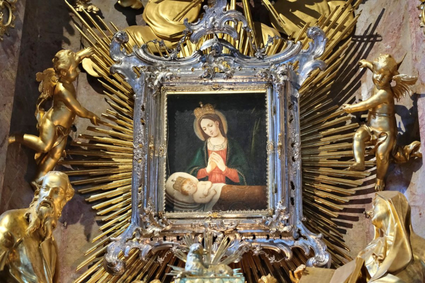 A szentmise végén Veres András püspök a paptestvérekkel együtt a Könnyező Szűzanya kegyoltára előtt Mária-köszöntőt imádkozott.