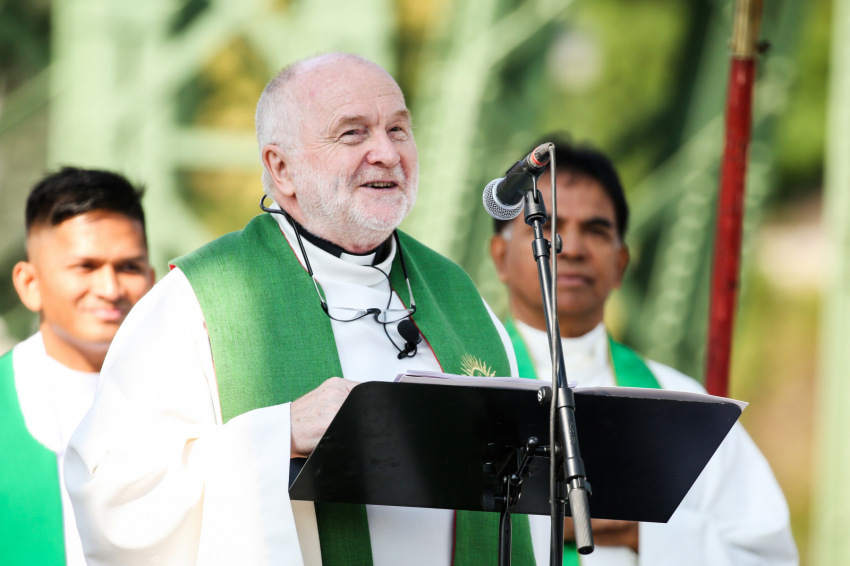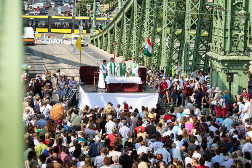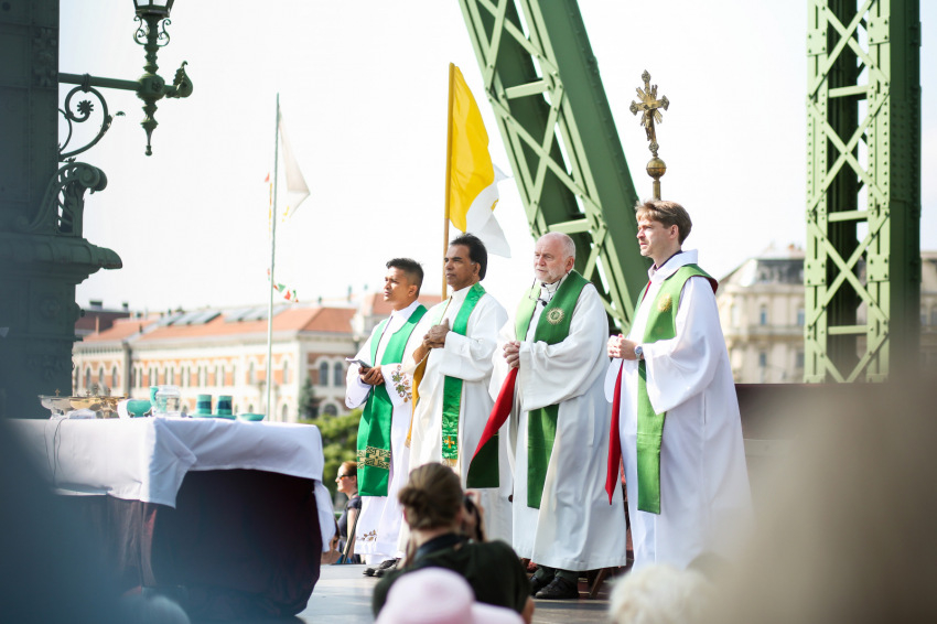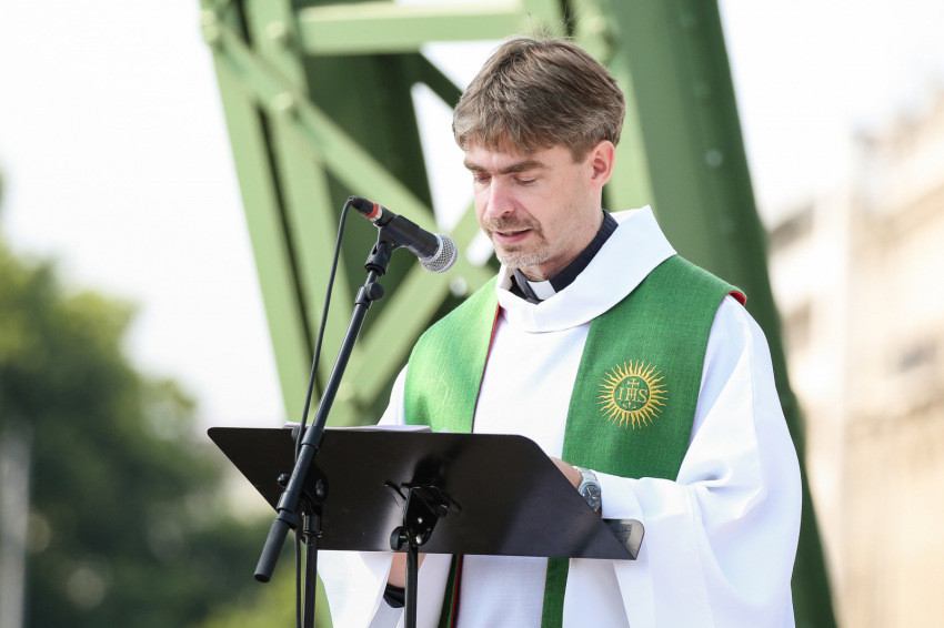 A hétvége nagy viharai között istenadta jó időben volt részünk, ahogy arra a főcelebráns is felhívta a figyelmet. Sajgó Szabolcs a nem szokványos misehelyszín szimbolikájára építette szentbeszédét. Rámutatott, hogy egy folyó fölött vagyunk, ami az életnek, a mi közös életünknek a jelképe, amely Isten életének végtelen óceánjába torkollik. Beszélt arról is, hogy a város, a Bibliában szereplő mennyei Jeruzsálem maga is egy szimbólum, amelynek van ugyan köze a földi Jeruzsálemhez, de az e világival szemben mindenki belefér. Ezután következett a híd szimbóluma, a hídé, ami összeköti a város két pontját. A legnagyobb hídépítő, hídverő, az igazi pontifex maximus számunkra Krisztus, akiben leomlanak a kerítések, a falak, minden, ami az embert embertől elválasztja.