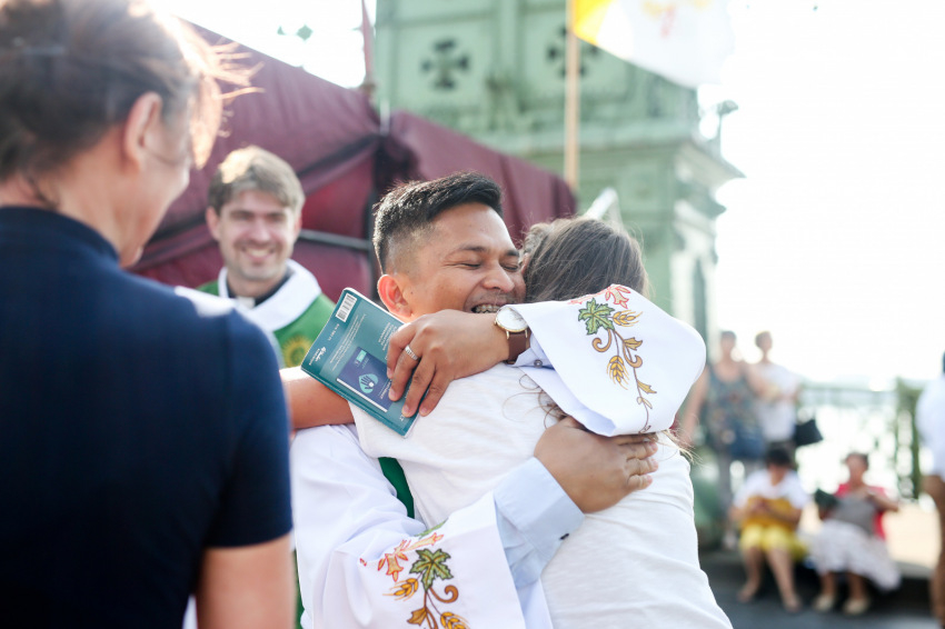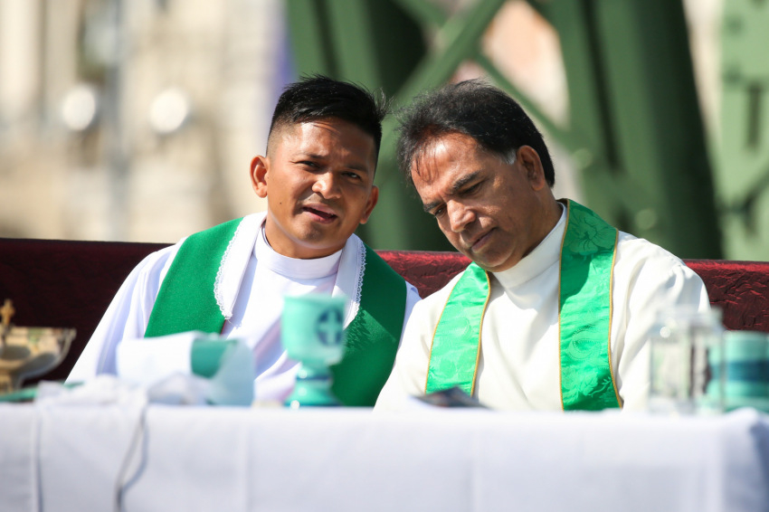 A legszebb katedrálisban vagyunk, ahol csak lehet lenni – Sajgó Szabolcs szavai a szentmise elején még jobban megadták az esemény emelkedett, mégis nagyon egyszerű és természetes alaphangját. A névnapját éppen július 28-án ünneplő Szabolcs atya eredetileg egyedül vezette volna a szentmisét, de a hívekhez hasonlóan az oltárnál is sokan lettek: csatlakozott hozzá rendtársa, Nagy Bálint, illetve a Fülöp-szigetekről származó verbita, Elmer Hernandez és a ghánai szalézi Michael Karikunnel is, mintegy a világegyházat képviselve.