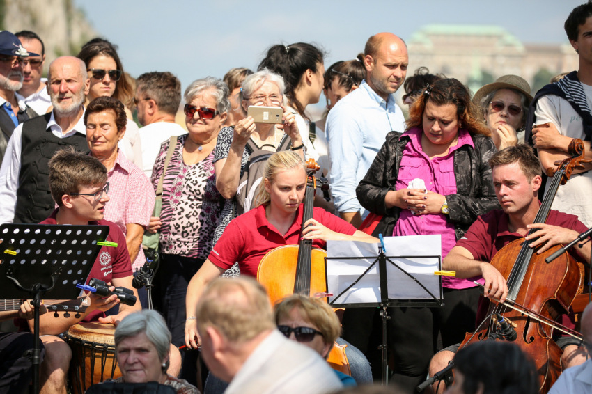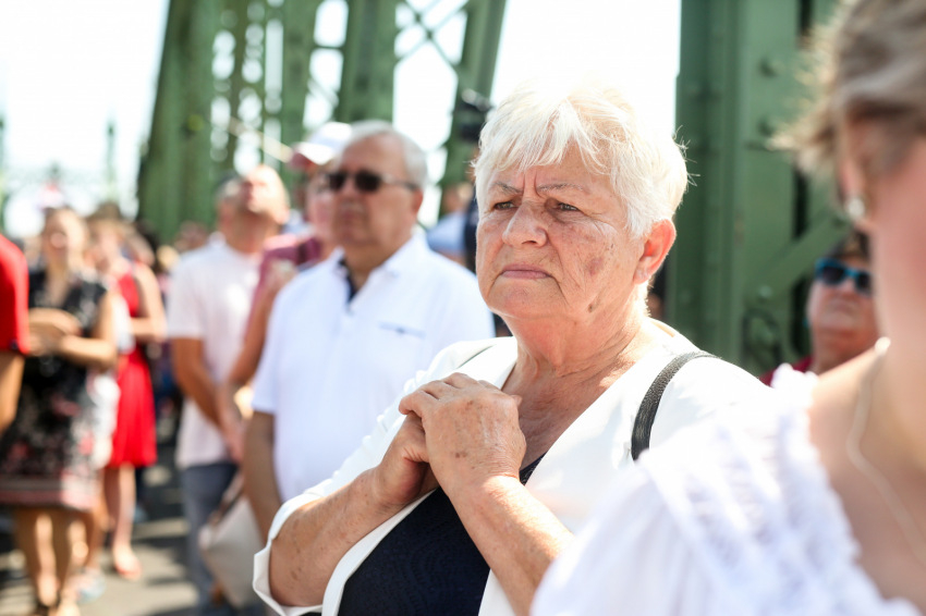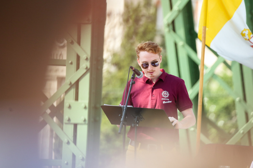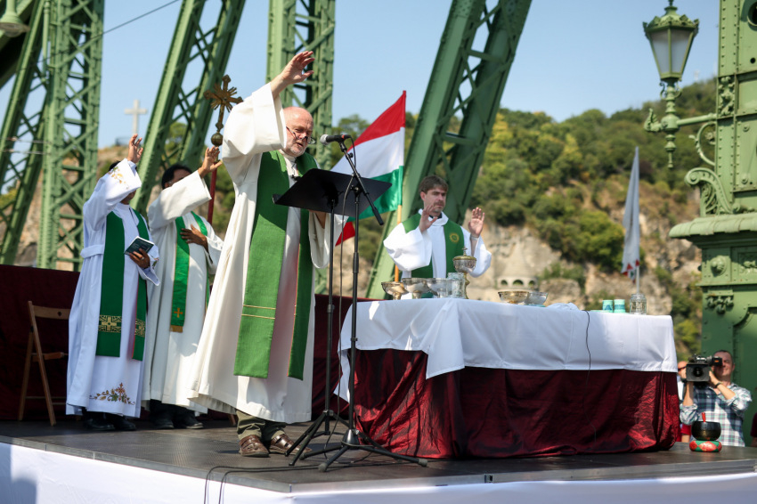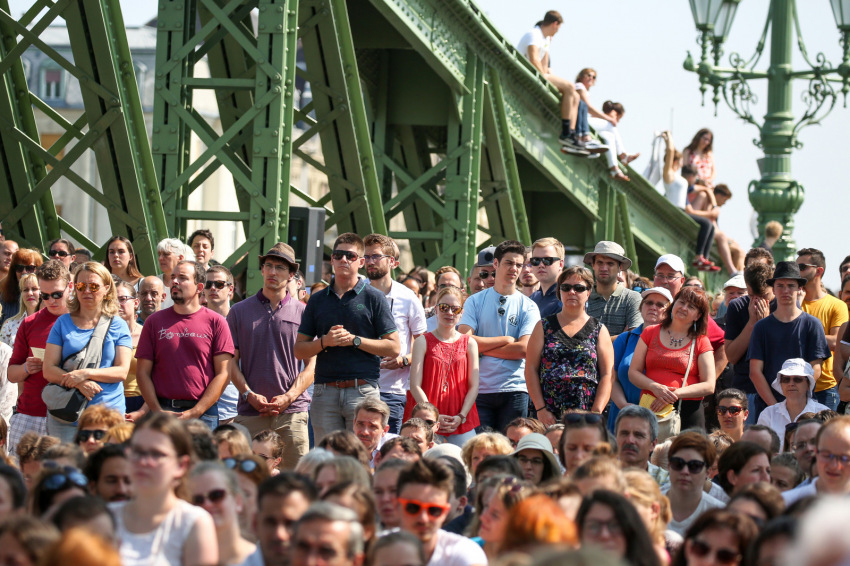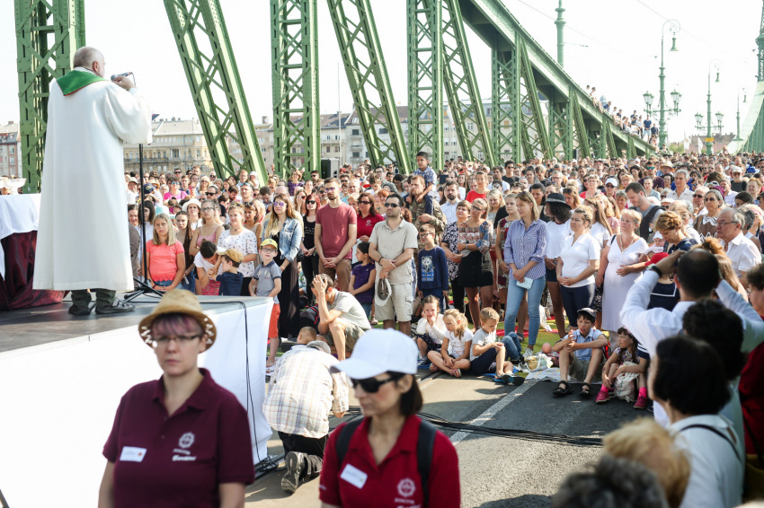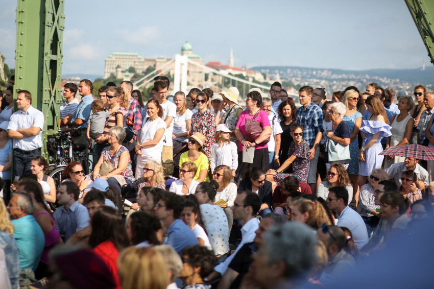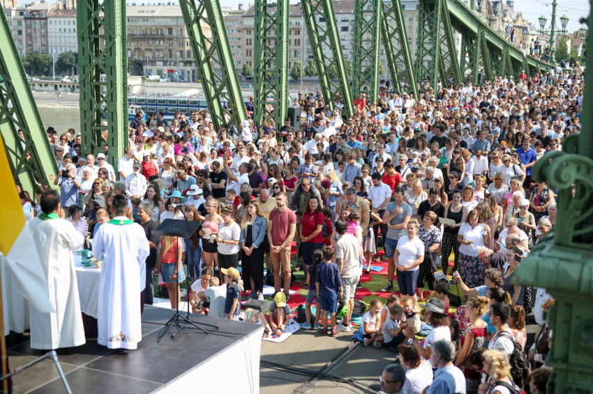 Szent István szobrát ugyancsak láthatjuk, ha a Sziklakápolna felé nézünk: ő erős kézzel harcolt a mi emberi szabadságunkért. Sajgó Szabolcs azt kérte a jelenlévőktől, hogy három hét múlva, az augusztus 20-i Szent Jobb-körmeneten adjanak ezért hálát első szent királyunknak, és ott is olyan vonzóan éljék meg a hitüket, mint itt, a Szabadság hídon.