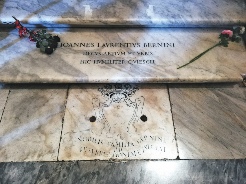 Utunk során eljutottunk a Santa Maria Maggiore-bazilikába is, ahová a nagy barokk mestert temették. Egyszerű sírban nyugszik, két lépcső alatt; egy kisméretű kőlap felirata jelzi földi maradványait. A történet szerint, amikor Bernini már idős és beteg volt, a pápa megkérdezte tőle, melyik templomban szeretne majd pihenni. Díszes sírhelyet ígért neki, olyat, amilyet csak akar. De Bernini ragaszkodott hozzá, hogy egy egyszerű kőlap nyugodhassék. A felirat szerint Nobilis familia Bernini hic resurrectionem expectat, vagyis: a nemes Bernini család itt várja a feltámadást.