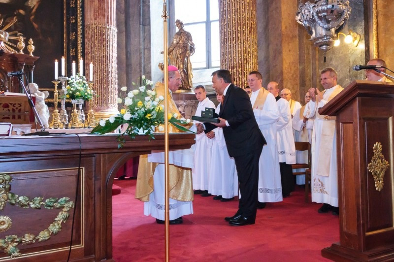 Az áldozás utáni könyörgést követően Orbán Viktor miniszterelnök személyesen jelentette be, hogy Pápai Lajos győri megyéspüspök a Magyar Érdemrend nagykeresztje polgári tagozata kitüntetést kapja. Ünnepi köszöntőjének kezdetén a miniszterelnök felidézte az egyház és az állam szétválasztásának dilemmáit. Kiemelte, az egyházi főpásztorok mindig sokkal magasabb helyről kapják szolgálatukért a jutalmat vagy a dorgálást. Földi hatalmak az isteni ítélethez nem tudnak hozzátenni.
