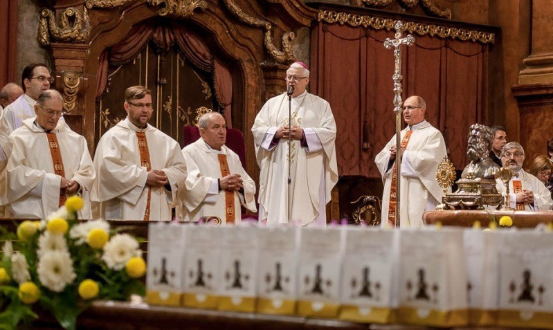 Itt van velünk a szent király, akinek szava parancsolt, akinek engedelmeskedtek az emberek, és aki királyi méltóságában mégis szolgálni akart. És itt van az, akit talán a földön legjobban szeretett: a felesége, Gizella, aki bajor földről hozta magával a hitnek nemcsak ismeretét, tudását, hanem a megélt hitet is. Keze nem szűnt meg imádságra összekulcsolódni, szívéből újabb és újabb jótettek fakadtak, igyekezett gondját viselni a szegényeknek, gazdagítani az egyházat, a templomokat; hímezte a liturgikus ruhát, amelyet ma is koronázási palástként tisztelünk – mondta Spányi Antal. – És itt van velünk Szent Imre, az a gyermek, aki felnövekedve megszerezte mindazt a tudást, amit megszerezhetett, hogy betöltse az Istentől neki rendelt hivatást. Kész lett volna az egyházi szolgálatra, mert tiszta szívében tiszta lánggal égett az isteni szeretet, de kész volt arra is, hogy egy más, ugyanolyan nehéz küldetést is vállaljon, hogy atyja helyett átvegye ennek a népnek a védelmét és irányítását, az ország építését és gyarapítását, a magyarság jövőjének és sorsának egyengetését.