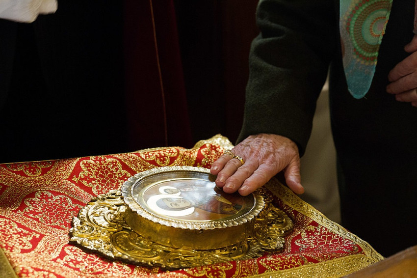 Az ikon Veszprémből érkezett Baranya megye székhelyére, először a Xavéri Szent Ferenc görögkatolikus templomba, ahol hívők sokasága várta, és Kocsis Fülöp hajdúdorogi megyéspüspök vezetett parakliszt. (Paraklisz: könyörgő ájtatosság az Istenszülő Szűz Máriához. A görög παράκλησις ’odahívás, segítségül hívás, kérés; buzdítás, felszólítás; vigasztalás’ szóból – a szerk.)