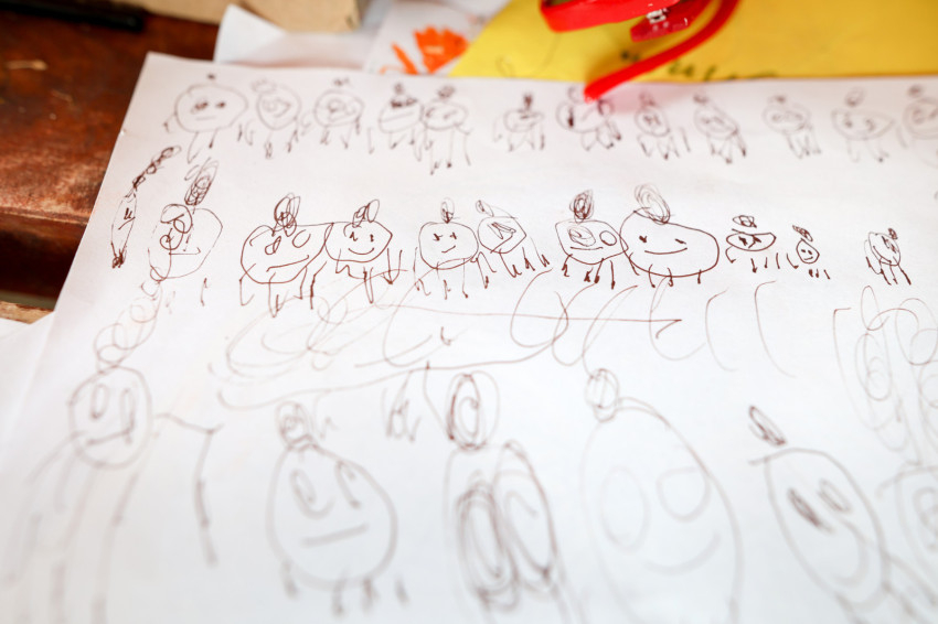 Csúcs Borbála szintén segítőként érkezett a táborba, a Down-szindrómás testvérét kísérte el. Éppen rajzolnak egy szaletli alatt, míg mások gyöngyöt fűznek. Általában együtt van a csapat, ők a sötétkékek. Bori háromszor volt már táborban a testvérével, aki most tizennégy éves, és otthon is emlegetni szokta ezt a felejthetetlen élményt. A segítők is tartják a kapcsolatot egymással év közben – tudom meg Boritól.