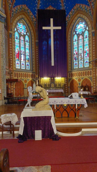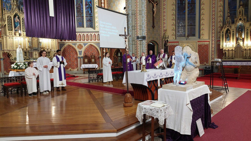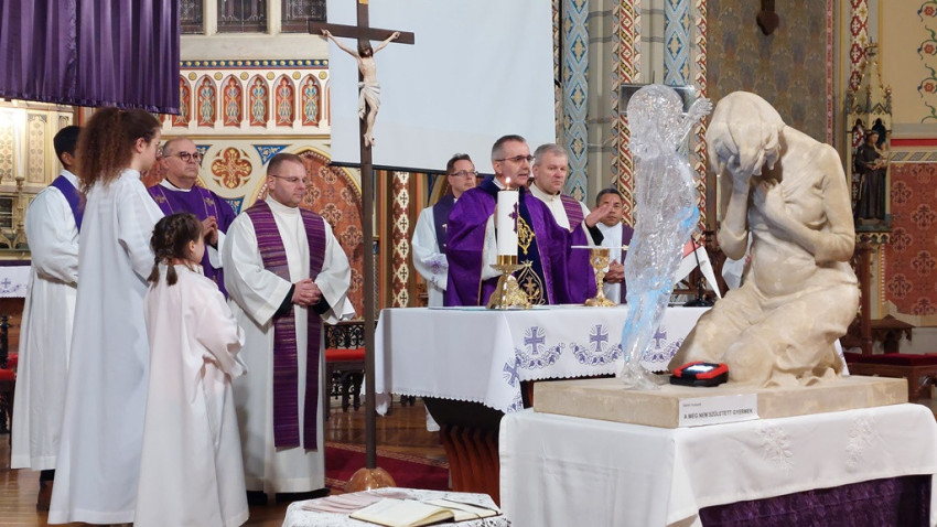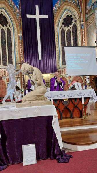 Az oltár előtti szobor is gondolkodásra késztet és bűnbánatra int. De nem szabad elfelejteni, hogy Isten mindig készen áll arra, hogy megbocsásson, ha őszintén bánjuk és beismerjük bűneinket. Ő irgalmas. Jézus az Atya irgalmát hozta közénk, feláldozta magát értünk – emelte ki szentbeszédében a szónok.