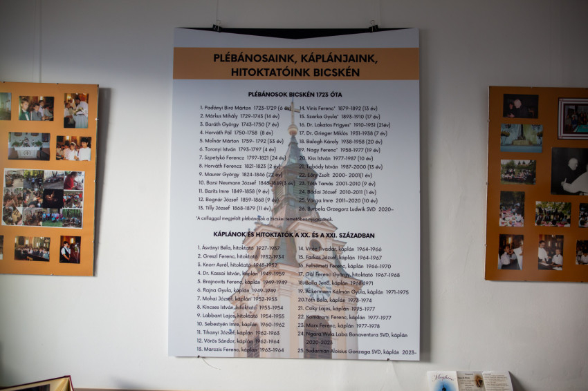 A plébánia történetéről fotókat láthatunk, például egy százéveset is, amely az 1920-as években történt harangszentelésnek állít emléket. Egy másik képen Bicske híres plébánosa, Tabódy István látható II. János Pál pápával a Szentatya 1991-es magyarországi látogatása idején.
