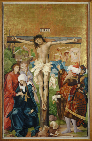 A megfeszített Krisztus halálának drámai pillanatát látjuk. A Megváltó feje oldalra hanyatlik, szeme kifordul, ujjai görcsbe rándulnak, teste megfeszül. Nagy méretű ágyékkötője kibomlani látszik: a kereszt mögé hosszan átlibbenő, szív alakú formákat képező drapériavég MS mesternek nem csupán erre a képére jellemző, szembetűnő sajátosság. A drapériatanulmánynak is beillő részlettel a festő tudatosan választ az adott tartalomhoz illő formát: a szélfútta drapériavég MS mesternek a Magyar Nemzeti Galériában őrzött Vizitáció-jelenetéről, az egykori selmecbányai oltár másik, talán leghíresebb képéről is ismert. Ott Mária fejkendőjének ábrázolásán találkozunk ezzel a formával, az összefüggés pedig talán nem véletlen, és nem szorítkozik a motívumra: a középkori szöveghagyomány szerint Krisztust, ruháitól való megfosztását követően, Mária takarta be a saját fejkendőjével.