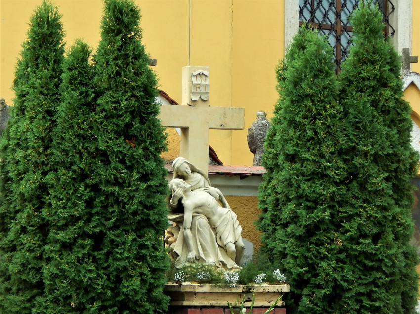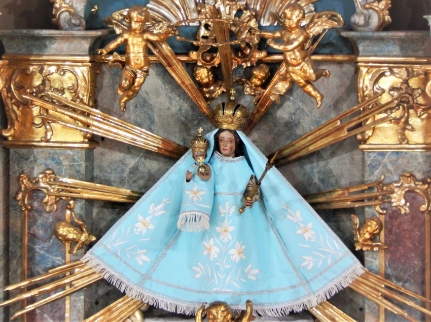 Áhítattal borulok le e szent helyen, vigasztaló mosolyú szobrod előtt, örömünknek oka, Boldogságos Szűz Mária. Lelkem tele bűnnel és hibával, szívemet annyi gond és baj vérzi, de Te segítesz, Istennek szent Anyja.