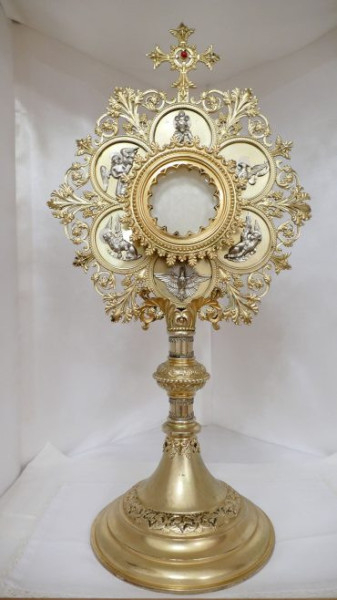 Kisebb betűkkel még belevésték, hogy 1938-ban az Eucharisztikus Világkongresszuson ezt a monstranciát vitte Pacelli bíboros. A monstrancia teljesen megfeketedve került elő. A szakemberek szerint ez a jele annak, hogy valóban ezüstből készült. A megtisztítás után pedig az arany réteg is felcsillant.