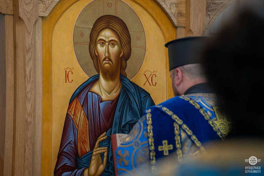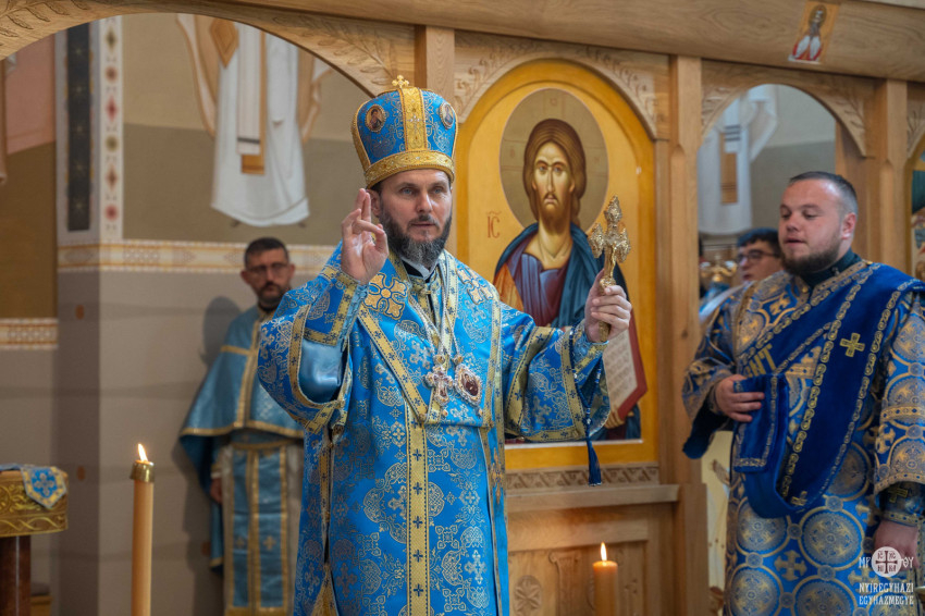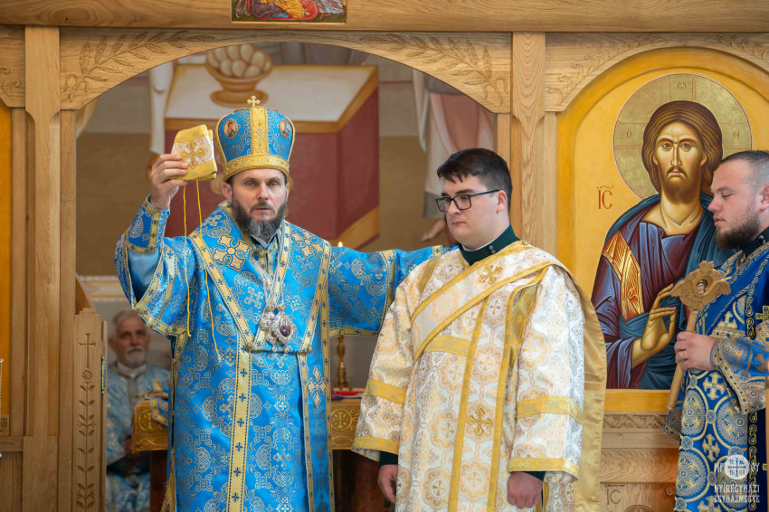 A Szent Liturgiára az Istenszülőt idéző kék színű, liturgikus öltözékben vonult a papság és az asszisztencia a Nyíregyházi Egyházmegye és a Görögkatolikus Papnevelő Intézet közös udvarán.