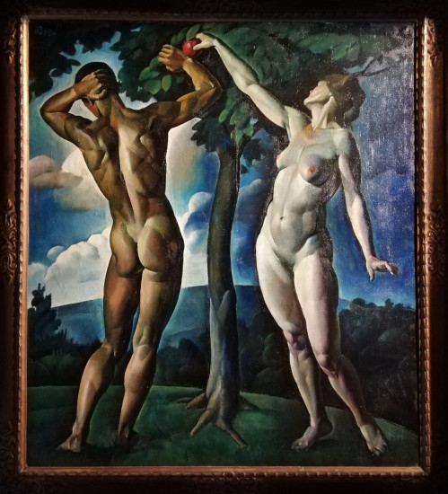 Hasonlóképpen megkerülhetetlen mű Patkó Károly Ádám és Éva (1920) címet viselő remek alkotása. A majdnem életnagyságú, lendületes figurák kifejezők, kissé teátrális mozdulataik a lényegre utalnak: Éva éppen készül leszakítani az almát; Ádám hárító, még bizonytalan, nem tudja, mi a jó döntés. A kép expresszivitását csak fokozzák az erőteljes színek. A festő a bibliai mondanivalón túl láthatóan kihasználja a lehetőséget az aktok megfestésére.