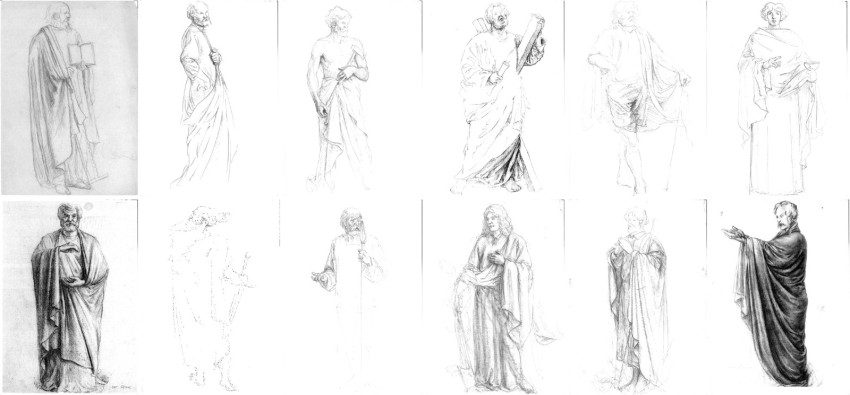 – Nehéz életszakaszban voltam, amikor megbízást kaptam arra, hogy a fehérgyarmati görögkatolikus templomba készítsek a tizenkét apostolról vázlatot, amelyek később egy ikonfalon bontakoznának ki. Izgalmas elképzelni, hogyan nézhettek ki a valóságban ezek az emberek. Többeket is megkerestem a kérdéseimmel, így Dávid Katalin művészettörténészt, a téma egyik legavatottabb szakértőjét is. Ő azt mondta: a szent a képen alapvetően nem a hasonlóság miatt válik azzá, aki, hanem az attribútumok és adott esetben a név írása alapján; de legfőképpen az attribútumok hordozzák azt a közösséget vagy azonosságot, amely révén ő lesz látható a képen. A nyugati ábrázolások egy részét ismertem, az ikonokat is tanulmányoztam. Rengeteg információval szolgált Leonardo Az utolsó vacsora címűképe is, az apostolok elrendezése, karaktere. Mindezeket a motívumokat felhasználva igyekeztem megalkotni az esztergomi galériában kiállított apostolábrázolásaimat. Ezek egyszerű vonalrajzok, a végleges munka nem valósult meg, nagy méretben csak Szent András képe készült el. Ám az érlelés folyamata során számomra emblematikussá váltak ezeket az alakok, most már nem változtatnék rajtuk, és mindegyiket megelőzi húsz-harminc másik rajz.