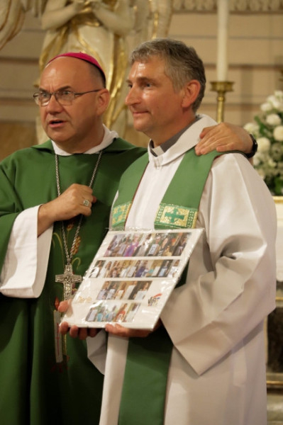 A püspöki mise keretében elbúcsúztatta Bezák Tamás korábbi egyházmegyei ifjúsági lelkészt, majd köszöntötte az ő feladatait szeptembertől átvevő Kovács Zsolt atyát.