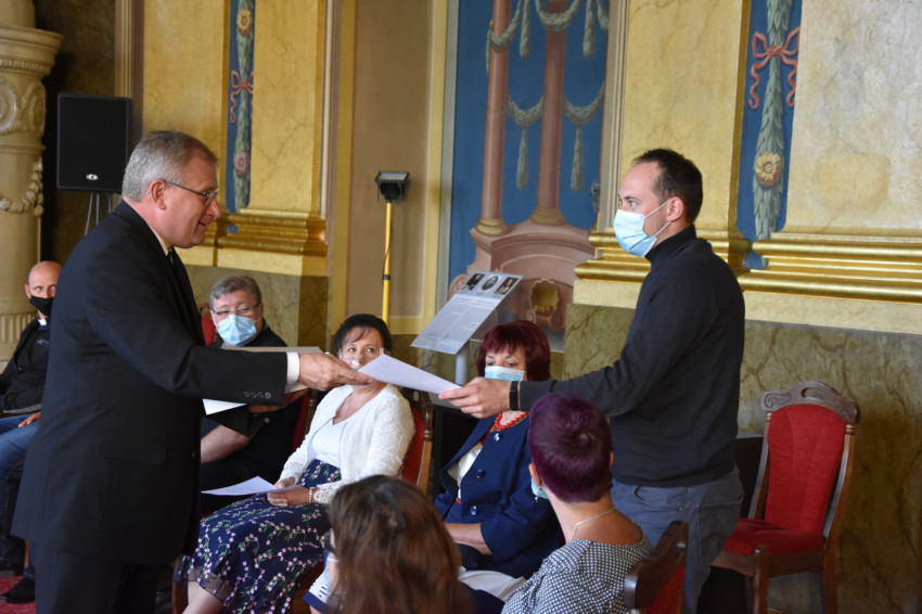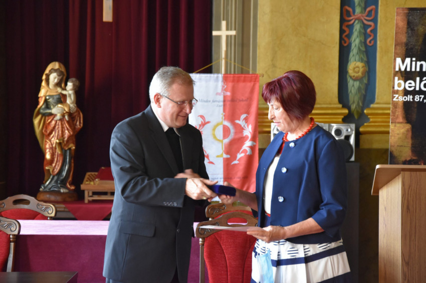 A találkozó végén együtt köszöntötték Kötting Ilona hitoktatót, akit huszonnyolc éves hitoktatói tevékenység után búcsúztattak el, megköszönve munkáját, barátságát, segítőkészségét. A több évtizedes kitartó munkával szerzett érdemek elismerése jeléül a nyugdíjas hitoktatónő az egyházmegyei érdemérem bronz változatát vehette át Böcskei László püspöktől.