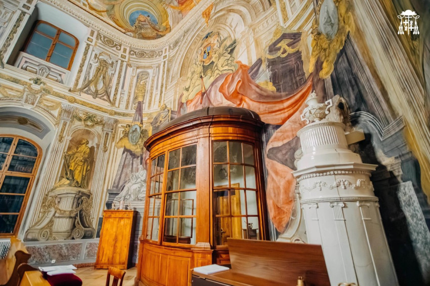 A háttérben kilátás nyílik az oszlopcsarnokos átjárókkal övezett nagyobb épületek felé, az utcára. Két allegorikus kép – a hit legyőzi a bálványimádást és a vallás leigázza az eretnekséget és a gyűlölködést – látható a főoltár két oldalán.