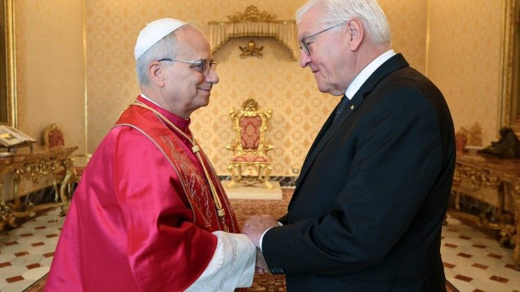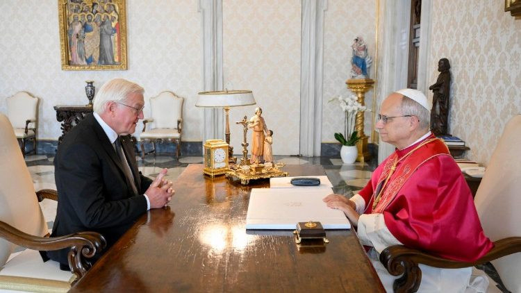 Frank-Walter Steinmeiert a hétfő délelőtti pápai audienciára felesége, Elke Büdenbender is elkísérte. A Német Szövetségi Köztársaság elnöke ezt követően a vatikáni Teuton Kollégium előtt tartott sajtótájékoztatón elmondta, hogy lehetősége volt hosszasan beszélgetni a pápával, akivel véleményt cseréltek a globális helyzetről, a háborúról és a békéről, valamint a keresztény egyházak helyzetéről.