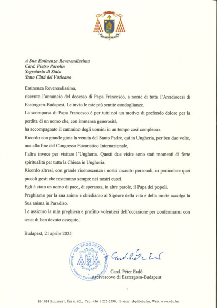 Ferenc pápa halálhírének megérkeztével az Esztergom-Budapesti Főegyházmegye egész közösségének nevében küldöm mély együttérzésem kifejezését.