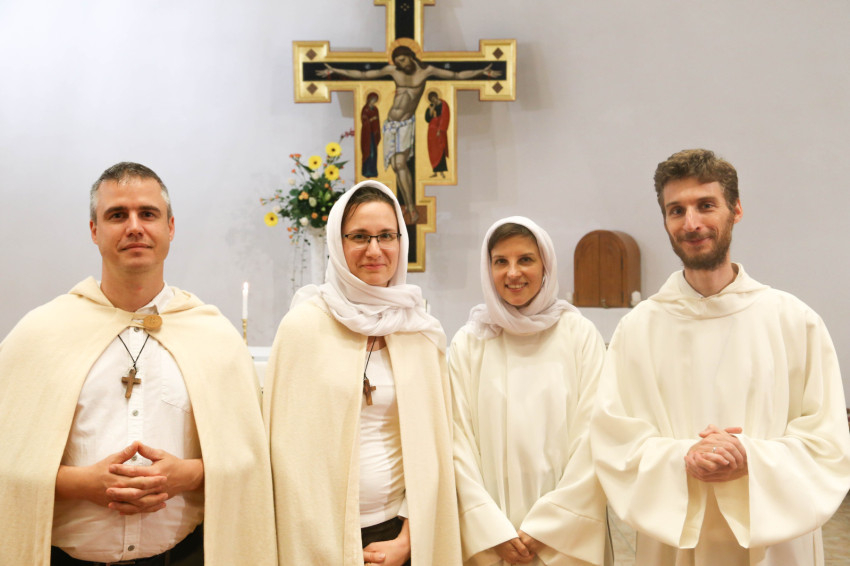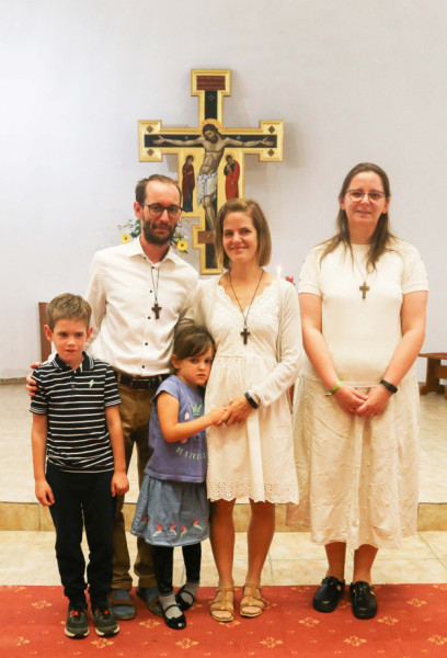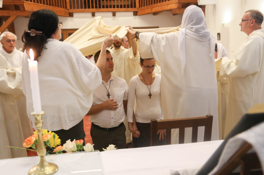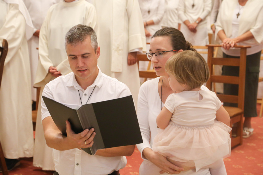 A szombati szentmise keretében köteleződött el véglegesen a közösség laikus ágában a Kamenár házaspár, Ági és Gábor, akik a homokkomáromi házhoz kapcsolódóan elsősorban a fiatalok evangelizációjában, a Tábor Hegyi Napok szervezésében veszik ki évek óta a részüket. Az elköteleződéssel megkapták a közösséghez tartozást jelképező, Isten Bárányával díszített keresztet és a kórusruhát, amelyet a közösség tagjai a liturgiákon viselnek.