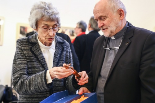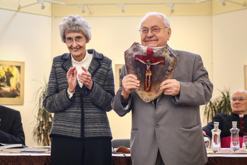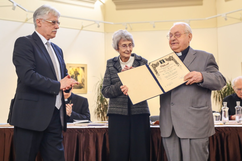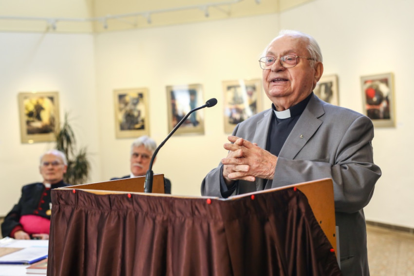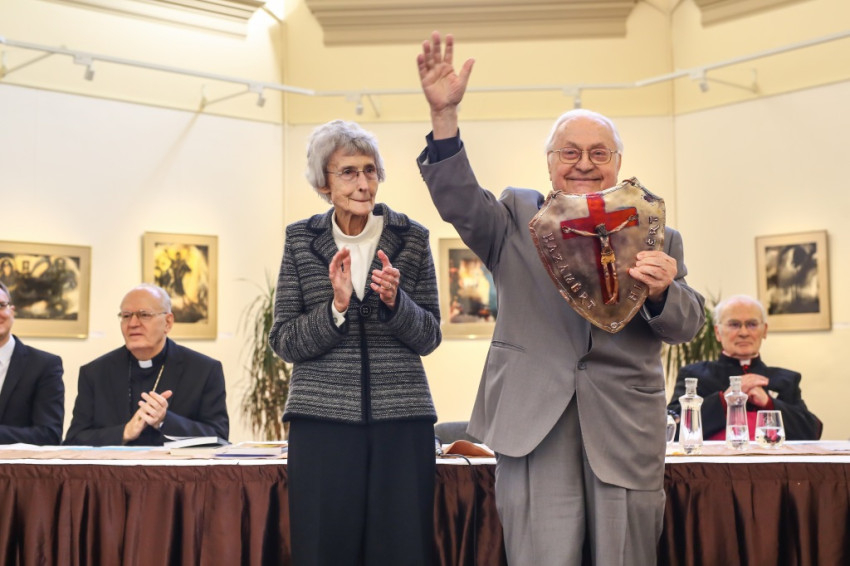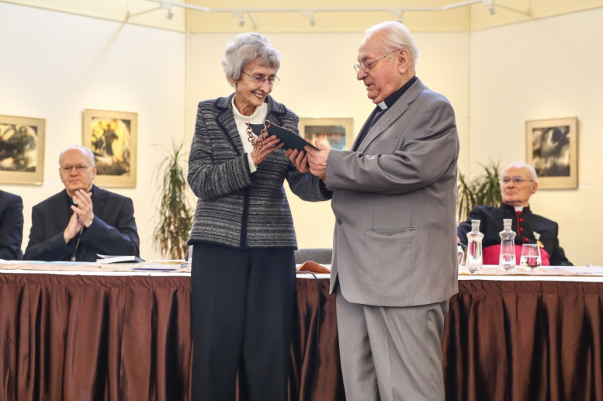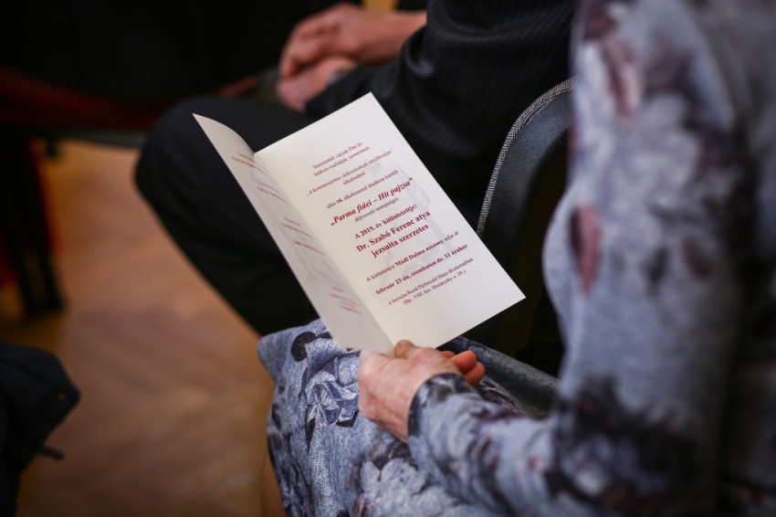 A díjat a hagyományoknak megfelelően Mádl Dalma adta át, ezt követően Szabó Ferenc szólt néhány szót az egybegyűltekhez. Aki már személyesen találkozott vele, tudhatja, a komoly gondolatokat megfogalmazó tudós mellett mindig megbújik benne a művész, a vidám, a viccre hajlamos ember is. Így volt ez most is. Utolsó mondataival megnevettette a jelenlévőket. Mosolyogva állt az emberek előtt, akik felállva, hosszú vastapssal köszöntötték az idei Parma fidei – Hit pajzsa díj kitüntetettjét – Szabó Ferenc jezsuita szerzetest.