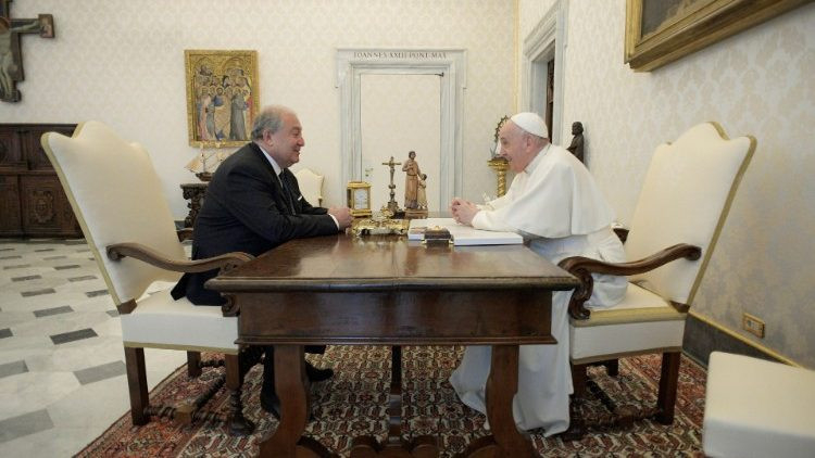 A Szentatya a 2021-es béke világnapi üzenetét, apostoli buzdításai és enciklikái egy-egy példányát, valamint „A virágzó sivatag” című képet ajándékozta Armen Szarkiszján államfőnek.