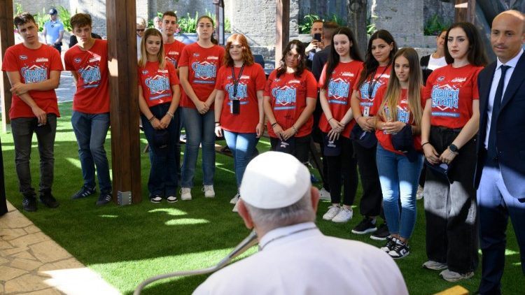 Később, a táborban a pápát Fernando Vérgez Alzaga bíboros és Raffaella Petrini nővér, Vatikánvárosi Állam Kormányzóságának elnöke és főtitkára fogadták. A gyerekek eközben padelt játszottak, kártyáztak, a medencében ugráltak, majd felhangzott a tábor himnusza, és nagy taps tört ki a Szentatya érkezésének hírére.