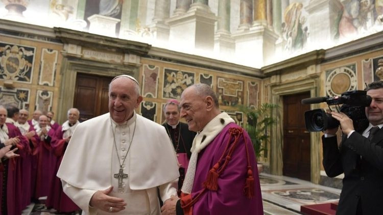 Szeretettel üdvözlöm mindnyájukat, kezdve a dékántól, akinek köszönöm szavait. Üdvözlöm mindazokat, akik részt vesznek ezen a találkozón: a Rota Romana Apostoli Törvényszék tisztségviselőit, ügyvédeit és más munkatársait. Szeretném kifejezni őszinte jókívánságaimat a ma megnyitásra kerülő bírói évadhoz.