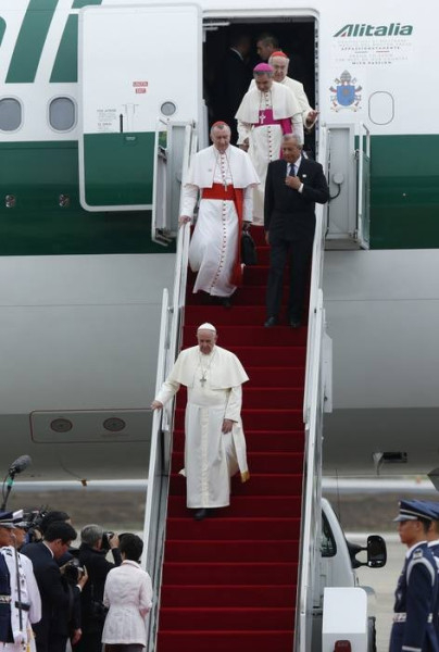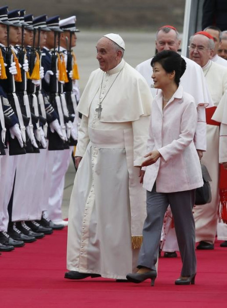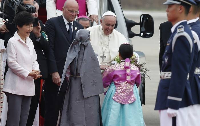 A pápa örül, és jó formában van – mondta Federico Lombardi. A repülőtéren a koreai elnök asszony, Pak Kunhje fogadta, ami nem megszokott gesztus – általában az államfő nem jön vendége elé megérkezésekor, hanem az elnöki palotában fogadja később. Az, hogy a repülőtéren fogadta, a különleges tisztelet jele, amit a Szentatya és a pápai küldöttség is nagyra értékelt.