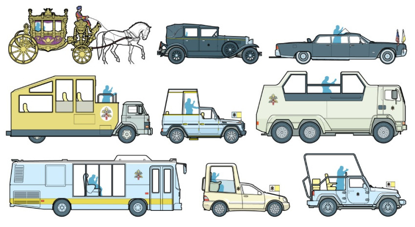 A Ferenc pápát és XVI. Benedeket ábrázoló képeken szinte ugyanolyan pápamobilokat láthatunk; a II. János Pált ért merénylet után azonban a biztonság megerősítésére törekedtek.